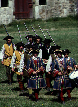 The troops stationed at Louisbourg prior to 1745 belonged, for the most part to the Compagnies Franches De La Marine ln 1744 there were eight companies in Louisbourg, each containing two drummers. Though such companies stationed in France also included a fifer in their ranks, there was only one fifer in Louisbourg to serve all eight companies. The Compagnies Franches also had a drum major. Picked from among the sergeants the drum major was responsible for the drummers in the same way as sergeant was for his company. During the years before the first siege, Louisbourg's drummers were paid as ordinary soldiers (This was changed while the troops were in France between 1745 and 1748, and the drummers who returned to Louisbourg received a higher rate of pay). They did have separate living quarters, however, and their uniform, trimmed with the livery of the king, must have helped them feel like part of an elite corps.