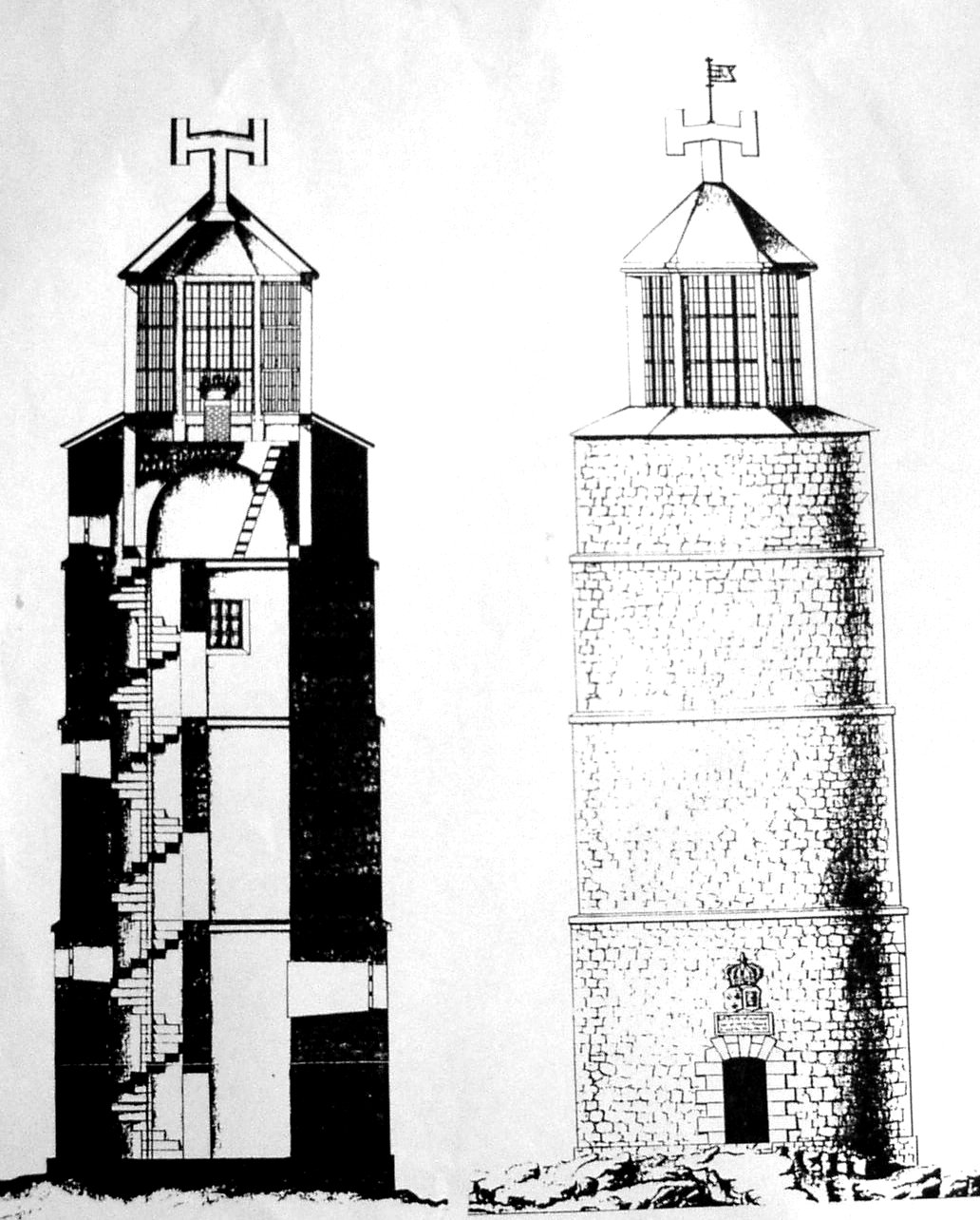 The French lighthouse, lit in 1734, before the fire of 1736 destroyed the wooden lanter on top of the tower. The light stood c. 22.3 metres high (74.6 feet)