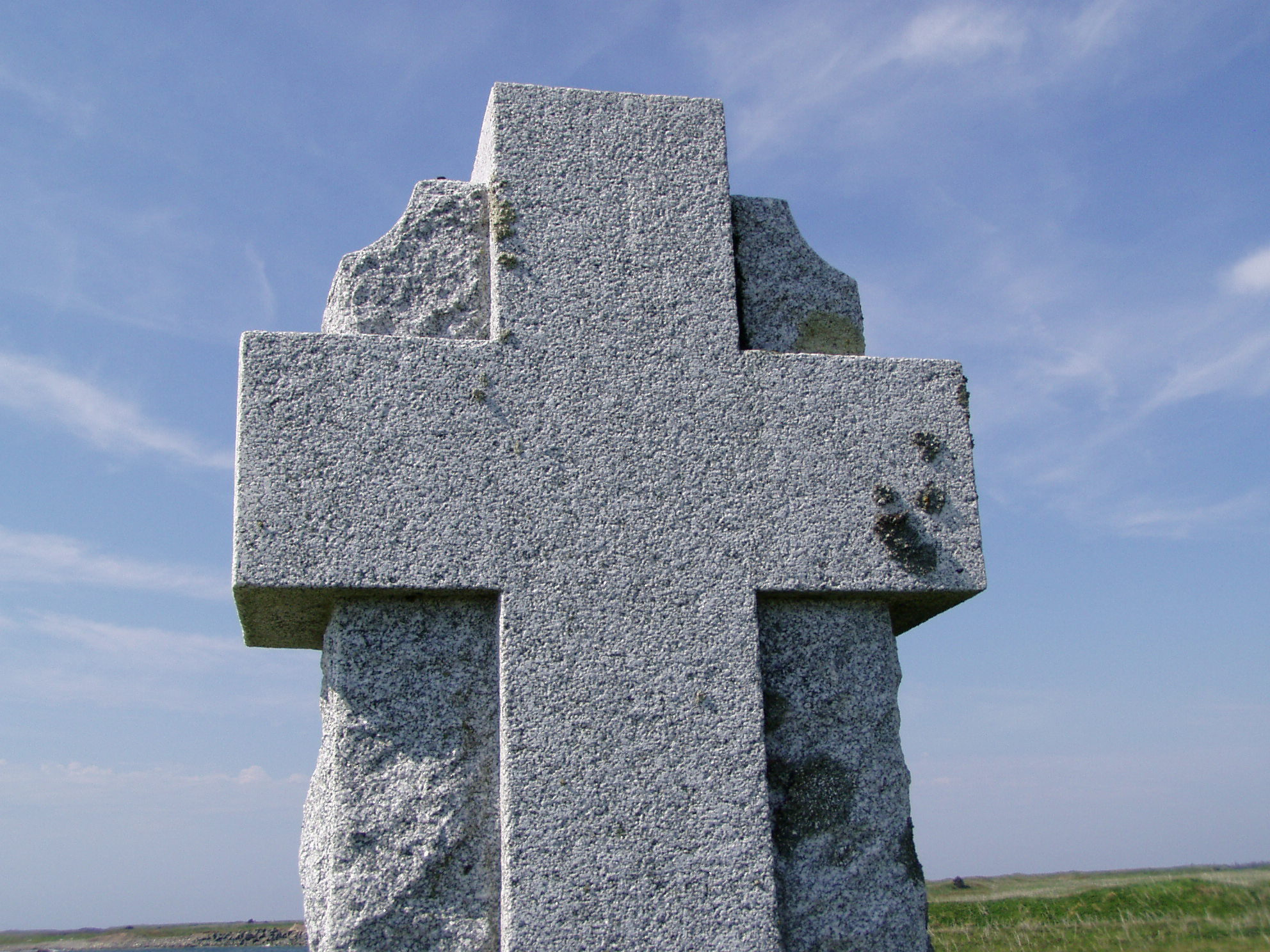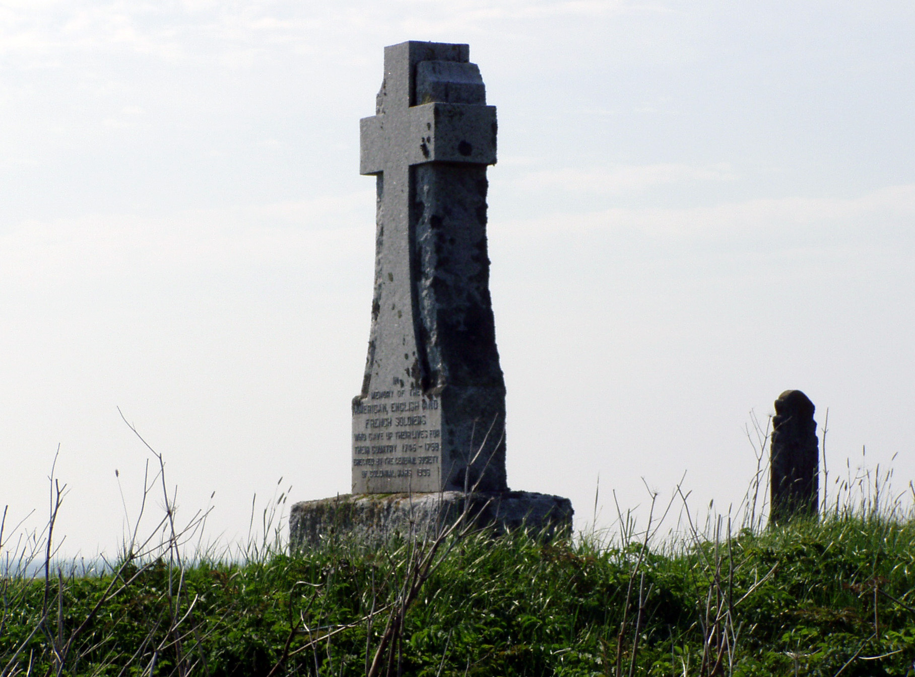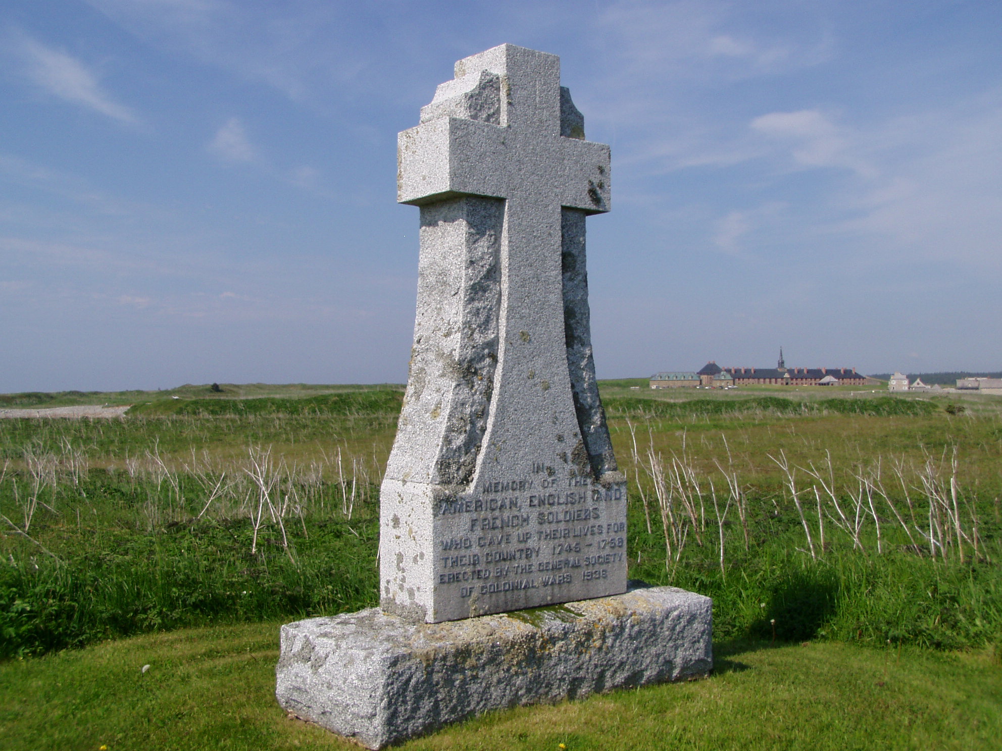 "Another memorial stone was erected in the year 1936 in the English Cemetery at Rochefort Point. This, too, was donated by the General Society of Colonial Wars and also through the efforts of Major Howland Pell, now Honourary Governor-General of the Society. This stone, in the form of a Memorial Cross, made of grey granite by the firm of John. D. Steele and Sons of North Sydney, who also made the Hospitalier Monument and erected the Replica Stone, was erected in memory of the New England, English and French soldiers, who gave their lives foe their country, 1745-1758."