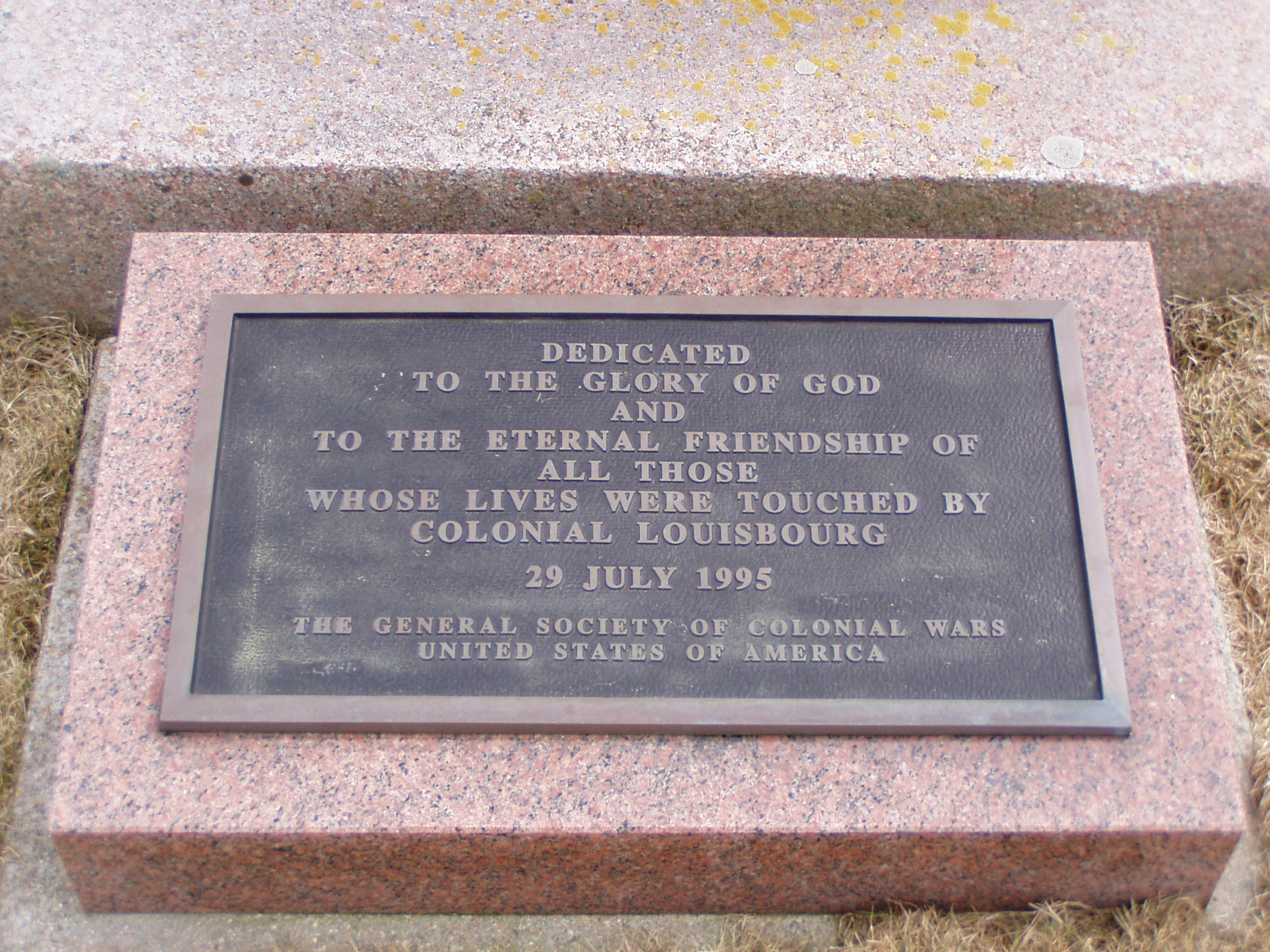 In 1995 during the July Grand Encampment which commemorated the 1720 official founding of Louisbourg and the 1745 siege of Louisbourg, the General Society of Colonial Wars returned to Louisbourg and dedicated a new stone at the foot of the one they had erected in 1895. It reads.