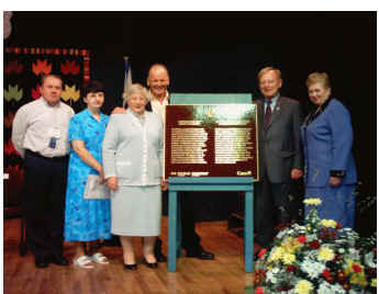 At Baddeck Academy with the unveiled plaque commemorating the founding of The Canadian Home and School Federation are (l-r) Glyn Morgan, VP Eastern Canadian Home and School Federation; Georgina Allen, National President, Canadian Home and School Federation; Nancy Langley, Baddeck Community Club; The Honourable Mark Eyking, MP, Cape Breton- Victoria; The Honourable Jamie Muir, Minister of Education, Nova Scotia; and Carol Whitfield, Field Unit Superintendent, CBI, Parks Canada.