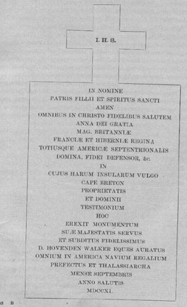 Being informed by several officers who had been there, that a Cross was erected on the Shoar, with the names of the French Sea Officers who had been here, which I looked upon as a Claim of Right they pretend to for the King their Master, the Island having been always in the times of Peace used in Common, both by the English and French for loading coals, which are extraordinary good here, and taken out of the Clifts with Iron Crows only and no other Labour : I thought it not amiss therefore to leave something of that kind to declare the Queen's Right to this Place; and having a Board made by the Carpenter, and painted, I sent him ashoar to fix it upon a Tree in some eminent Place where it might easily be seen, which was after this Form, with the Inscription following:-