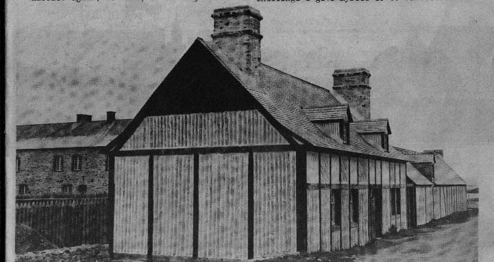 Now, we're still mystified about what we're going to do with the stone part of the de la Plagne house. Because the foundations that were found are very, very clear, that this part was obviously an addition. We had to presume that it was there in 1745; we're not absolutely sure. We have a drawing -- a general view of the town, seen from outside -- where we see this building, what we think is this building. And this end here, the extended part of the building, is not very clear. So, oh, we hemmed and hawed a long time before building that part. There's a later drawing, 1758. It's a strangely interesting drawing; it's a sort of a bird's-eye view of the town, based on imagination, largely. And it's all sort of distorted. But it's amazing how you can recognize some of the buildings. And this building, we see it. We see the number of windows. But we don't see any difference in the wall surface. It was very, very small scale, you know, and it's a thing which the artist might not have noticed. But on the other hand, it could have meant that either the planking continued over the stone extension, or that the same paint would have been applied on the stone surface. The stones could have been given a coat of mortar, and then the whole thing painted the same colour as the boards. And that's what we may do, eventually. We-don't know yet.