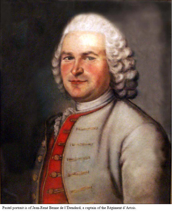 The pastel portrait of an Artois officer on display in the Bigot house. This portrait-- purchased for the Louisbourg collection in 1968 by Jean Palardy—is identified as Jean René Benne de L’Etendard, Captain of the Artois Regiment, in Louisbourg and Canada, 1755-1760.