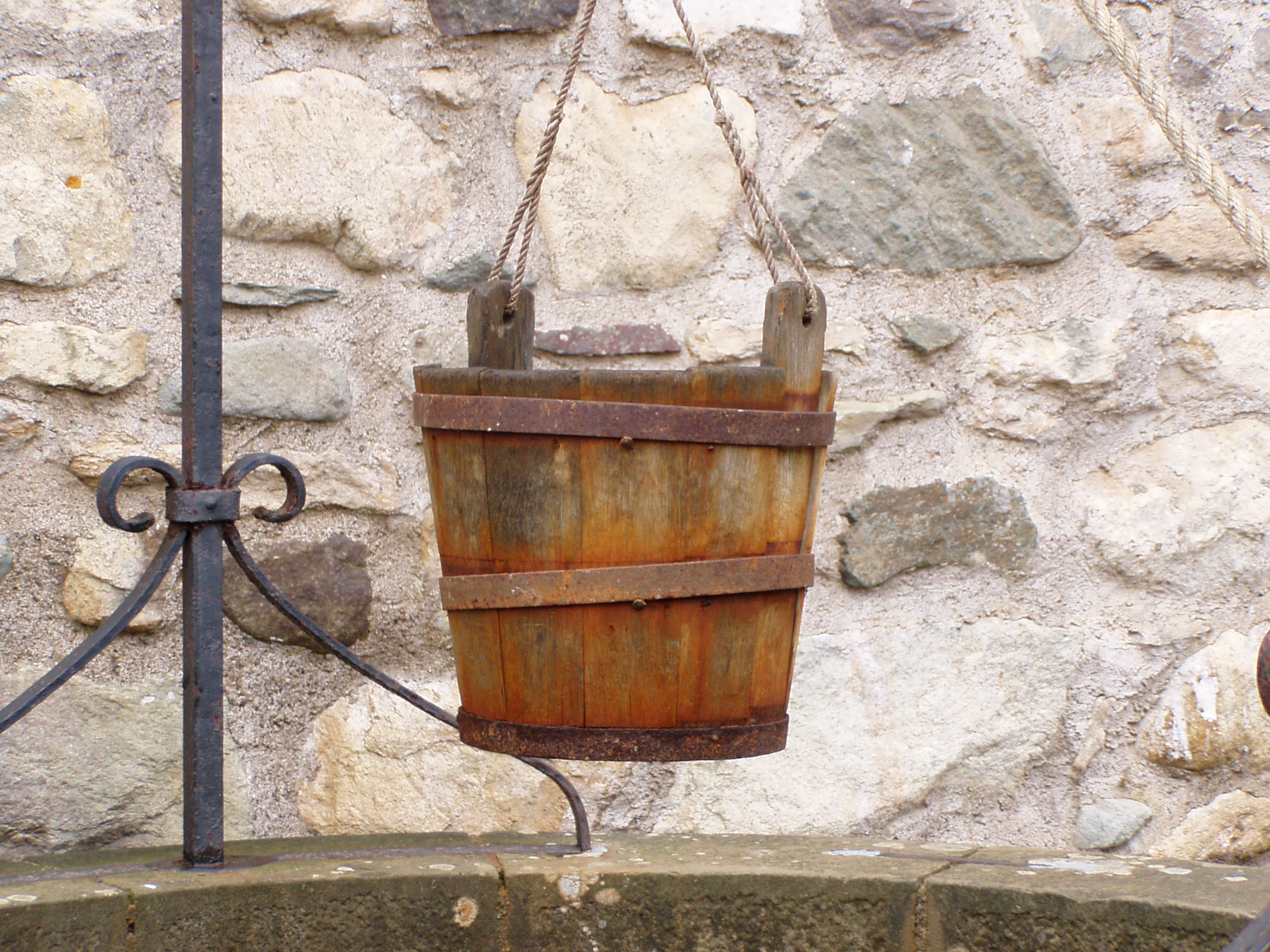 Town rooflines Bench on street  Rue Royalle: Looking east  Well on Rue Toulouse: Bucket