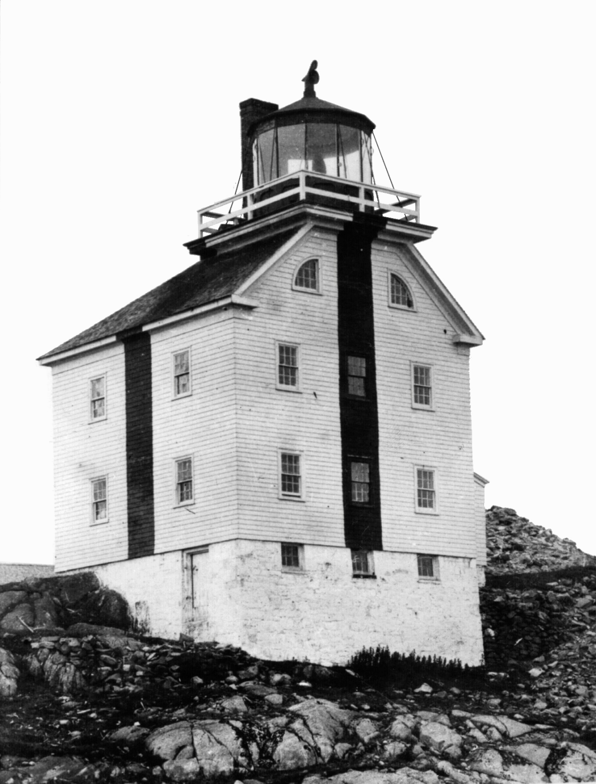 The lighthouse was wood frame, shingled and painted white with a black vertical line on three sides. It was 10.5 metres (35 feet) high to the vane on a 8.6 metre square (29 foot square), stone foundation.