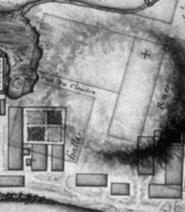(4) To the east, on a portion of, and to the west near Rue du Cloître, a cluster of wooden outbuildings were built, apparently after 1752 and prior to 1758, of which one was perhaps the monk's new residence