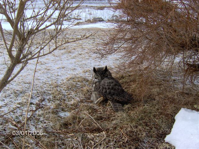 Ø Mary Price called me the morning of March 1 to say there was an owl beside her porch and it was in distress. I suggested she call the Fortress where she spoke with Warden Eugene Taylor who was very co-operative and said he would call the Department of Natural Resources for her. A naturalist arrived and observed the Owl for about an hour. 5 minutes before he arrived the owl flew away from the original location but was found about 100 feet from the house. Later it flew up into a tree. They were concerned that it might be injured in some way. The naturalist said that the trauma of taking a wild bird to a vet might be as dangerous as doing nothing. When the Great-horned Owl flew up into the tree he told Mary that if the bird had too much to eat it would not be able to fly any distance until the food was at least partially digested. Mary was able to take a couple of very nice digital pictures while it was close to her step, including the one seen above.