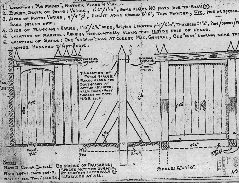 - "As-Found" palisade found in ditch had a horizontal peg hole not sloped as indicated on the design*sketch