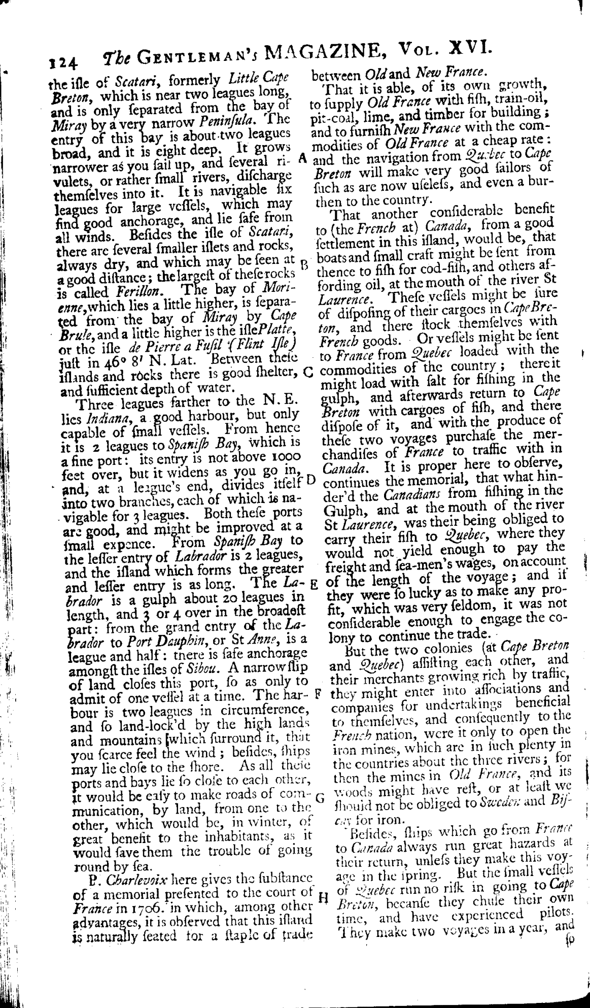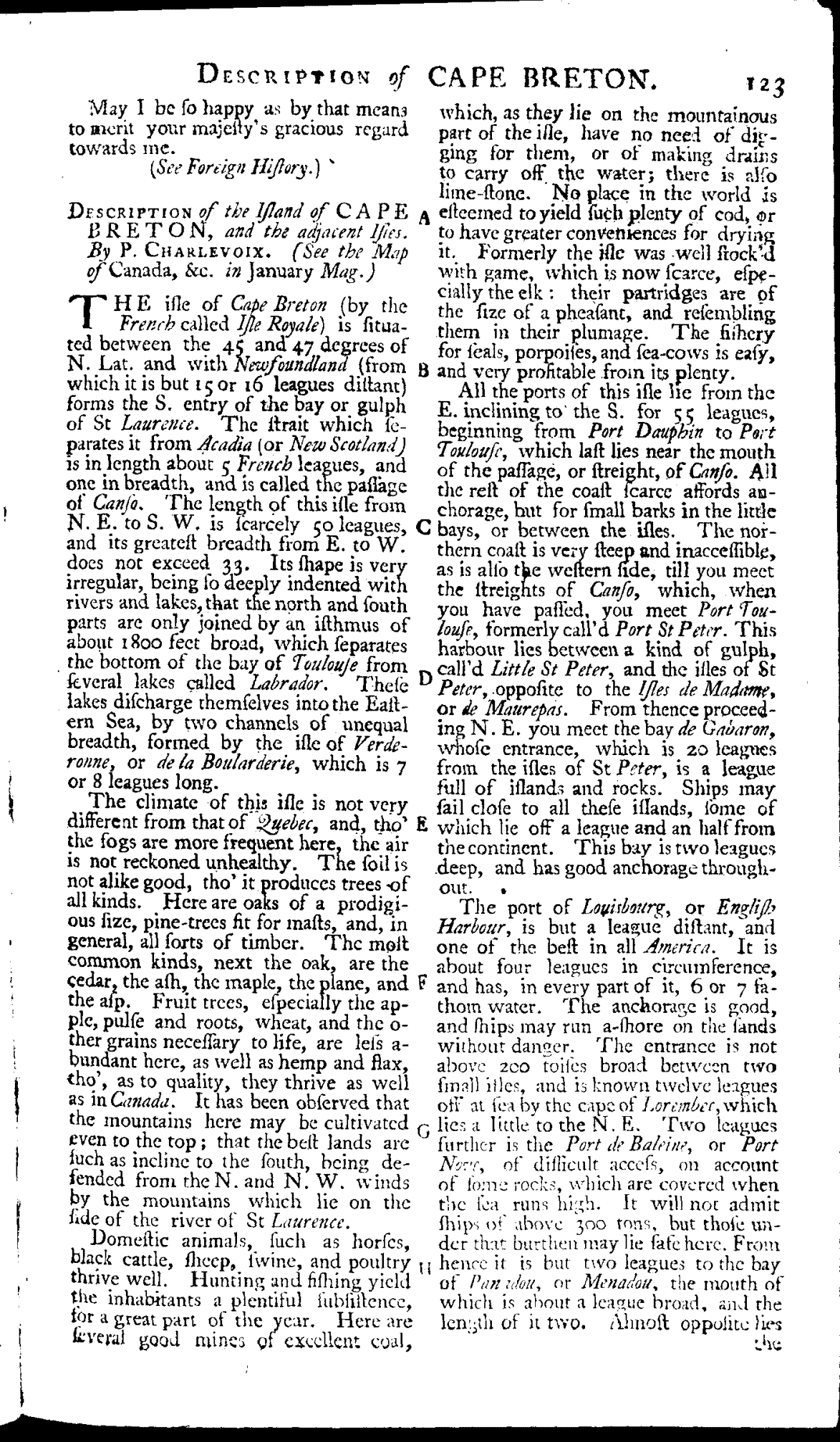 DESCRIPTION of the Island of CAPE BRETON, and the adjacent Isles, By P. CHARLEVOIX, (See the Map of Canada, &c. in January Mag.)