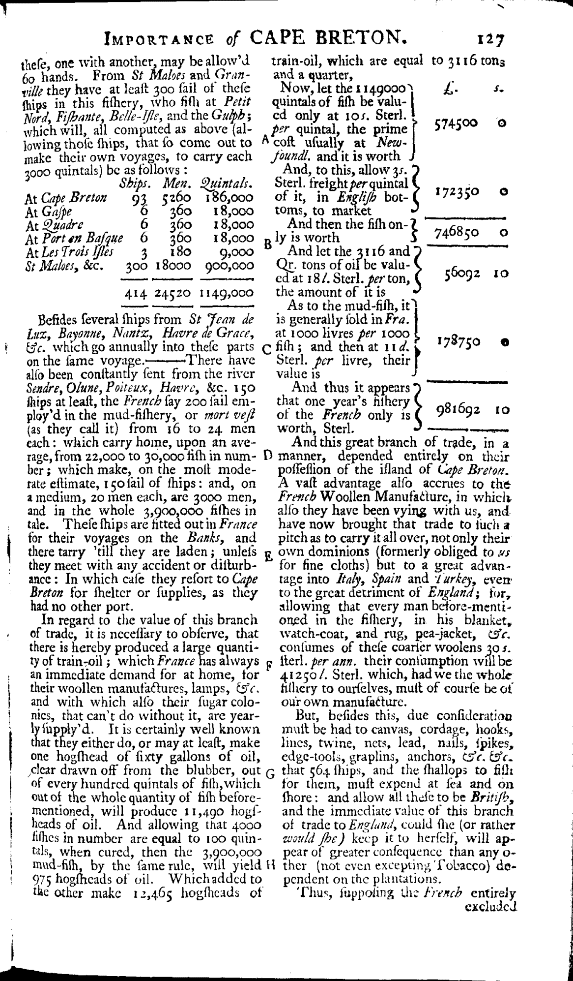4. That the fishery of the Newfoundland Islands and Banks (under which general Name I include cape breton, and all the rest of those seas) and the opposite coasts along the continent, might, if carried to the highest, and made the most of, by any one nation, be render'd of more value than the mines of Peru and Mexico, or any other possession of property that can be had in any part of the world.
