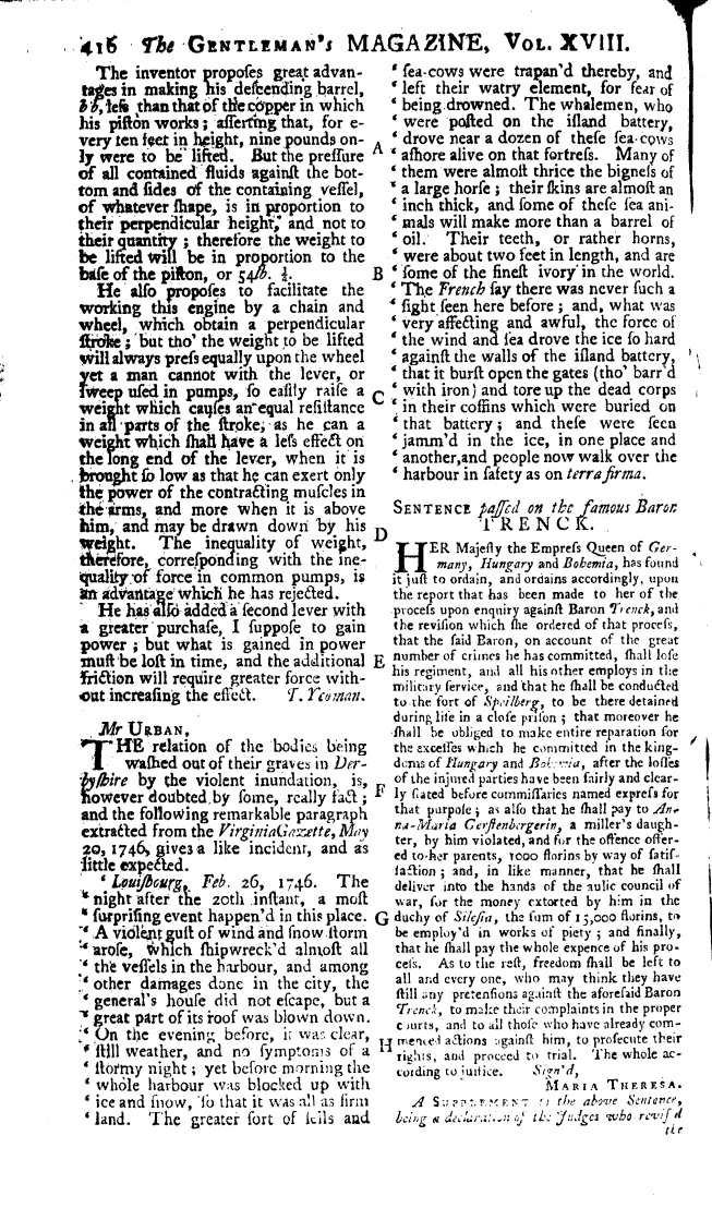 The Night after the 20th Instant, a most surprizing Event happened in this Place. A violent Gust of Wind and Snow arose, which shipwreck'd almost all the Vessels in the Harbour; and among other Damages done in this City, the General's House did not escape, but a great Part of its Roof was blown down. On the Evening before it was clear Weather, and no Symptoms of a stormy Night; yet before Morning the whole Harbour was black'd up with Ice and Snow, so that it was all as firm Land. The greater Sort of Seils  and monstrous Sea-Cows were trapann'd thereby and left their Water Element, for fear of being drowned. The Whalemen who were posted at the Island Battery drove near a Dozen of those Sea-Cows on Shore alive; on that Fortress Many of them were almost thrice the Bigness of a large Horse. Their Skins are about an Inch thick; and some of those Sea Animals will make more than a Barrel of Oil. Their Teeth, or rather Horns, were about 2 Feet in Length, and are some of the finest Ivory in the World. The French say there was never such a Sight seen here before. And, what was very affecting and awful, the Force of the Wind and Sea drove the Ice so hard against the Walls of the Island Battery, that it burst open the Gates (tho' bar'd with Iron) and tore up the dead Corps in their Coffins which were buried on that Battery, and these were seen jamm'd in the Ice, in one Place and another, as People now walked all over the Harbour in Safety, as on Terra Firma.