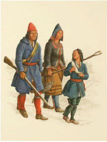 Mi’kmaw Man’s Costume Much of the information used to reproduce the most recent Mi’kmaw scout costume comes from two reports written for the Fortress of Lousbourg. The first report, “Costume Report: MicMac, Male, War, c. 1744”, was written in 1978 by Ruth Whitehead. In 1996, Trudy Sable was asked to “up-date” Ms. Whitehead’s report, by including any new information about Mi’kmaw men’s costume in a revised report. At the same time, Ms. Sable wrote a report about Mi’kmaw women’s costume. All of these publications are available through the library at the Fortress of Louisbourg. Francis Back, whose illustrations of Mi’kmaw men and women are on display in the De la Plagne exhibit, has done detailed research on the Canadian capote (a type of coat), information which was also very useful.
