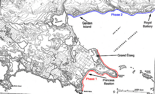 Although it may not be possible to halt the effects of erosion, we are able to rescue cultural data through archaeological salvage efforts, and in some cases we are able to protect the eroding resources with sea wall barriers, such as the large stone & concrete barrier at the Royal Battery located on the north shore of the harbour (figure 3).