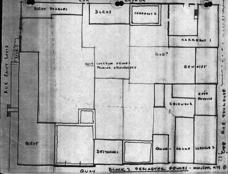Fence to be moved back to +- 2'-0 inside Destouches  Façade , & +- 4:0 inside Façade, with only posts (3) going into (+- 2'-6) Back-fill over Prevost Building remnents, end posts to be attached to building so as not to penetrate appreciably into fill nor touch interfere with D.F. Bldg.