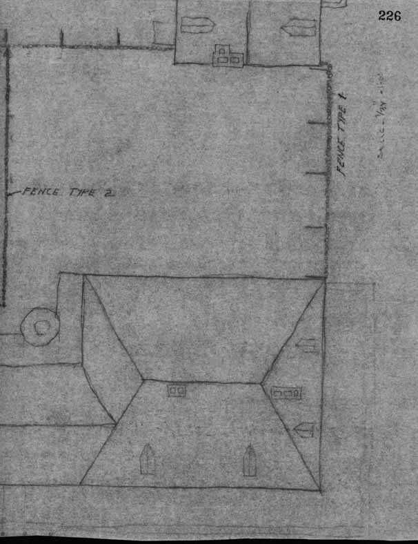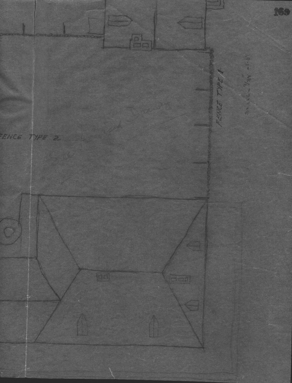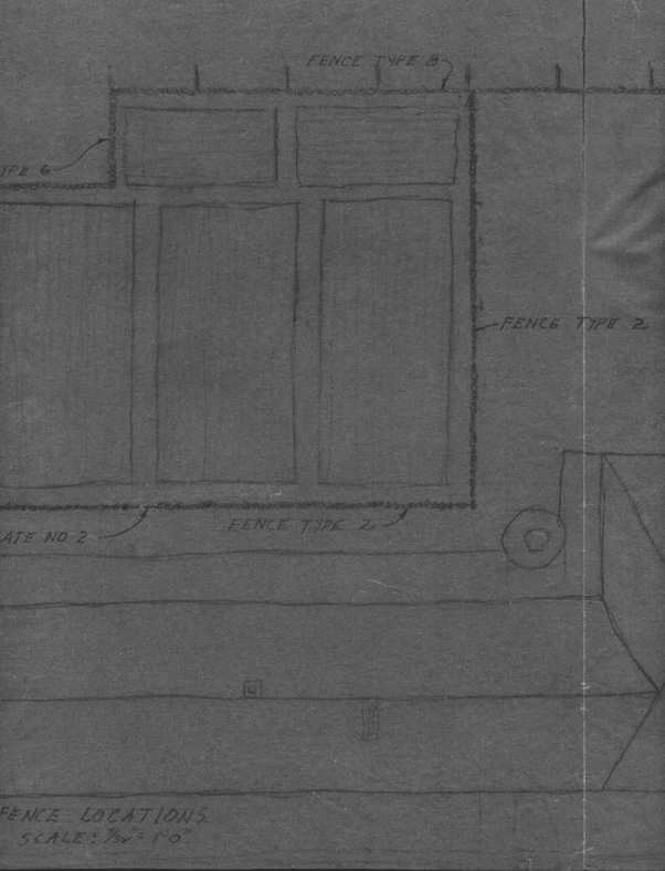 Fence # 1: A typical peeled, piquet fence, 4 - 6 po Ø with pointed heads, 5 pied high with ribbands 2 po. x 4 po... Also a simple barn-yard gate, piquet with braces & posts. Location as per plot plan ... [written in pencil after these minutes had circulated: "A" ? Fence # 1  Block 2 Landscaping 80 P # 12 Fence A]