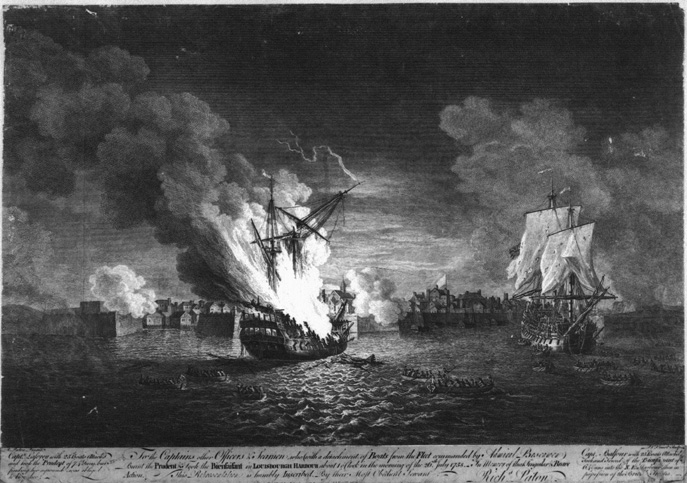 To the Captains other Officers and Seamen, who (with a detachment of Boats from the Fleet commanded by Admiral Boscawen) Burnt the Prudent and Took the Bienfaisant in Louisbourg Harbour, about 1 o'clock in the morning of the 26th July 1758. In memory of that Singular and Brave Action, This Re-presentation is humbly Inscribed, By their Most Obedient Servant, Richd Paton ...