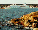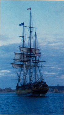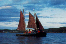 Tall ship "H.M.S. Rose" from Bridgeport, Conneticut, passing the Fortress of Louisbourg.
