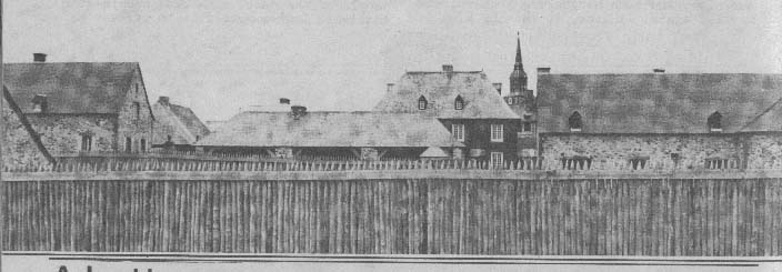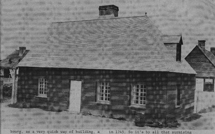 Now, we're still mystified about what we're going to do with the stone part of the de la Plagne house. Because the foundations that were found are very, very clear, that this part was obviously an addition. We had to presume that it was there in 1745; we're not absolutely sure. We have a drawing -- a general view of the town, seen from outside -- where we see this building, what we think is this building. And this end here, the extended part of the building, is not very clear. So, oh, we hemmed and hawed a long time before building that part. There's a later drawing, 1758. It's a strangely interesting drawing; it's a sort of a bird's-eye view of the town, based on imagination, largely. And it's all sort of distorted. But it's amazing how you can recognize some of the buildings. And this building, we see it. We see the number of windows. But we don't see any difference in the wall surface. It was very, very small scale, you know, and it's a thing which the artist might not have noticed. But on the other hand, it could have meant that either the planking continued over the stone extension, or that the same paint would have been applied on the stone surface. The stones could have been given a coat of mortar, and then the whole thing painted the same colour as the boards. And that's what we may do, eventually. We-don't know yet.