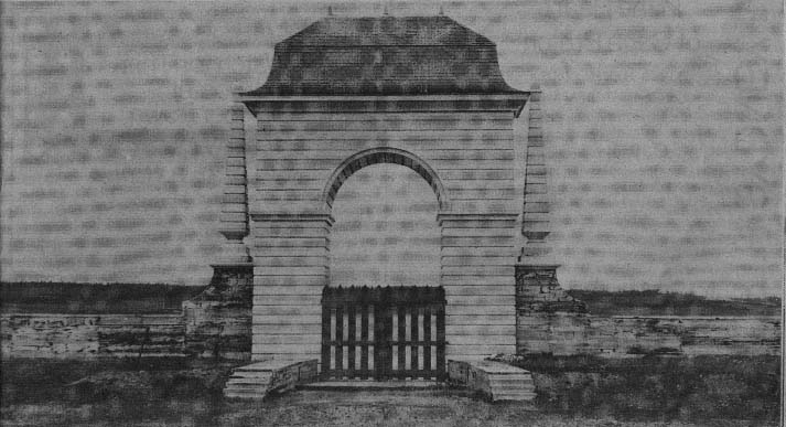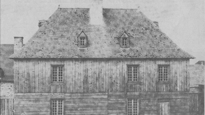 The boarding of the de la Plagne house-that's purely invention, but justified by this: the gate down at the bottom of the street, the Frédéric Gate, is built in wood -- we have a drawing of it. And it shows strips of wood like that, with the deep joint. These both were built about the same time. We know this house was planked, or boarded. And since we knew that they were fairly well-to-do--on and on like that -- we figured that, well, this house could very well have been boarded like the Frédéric Gate.