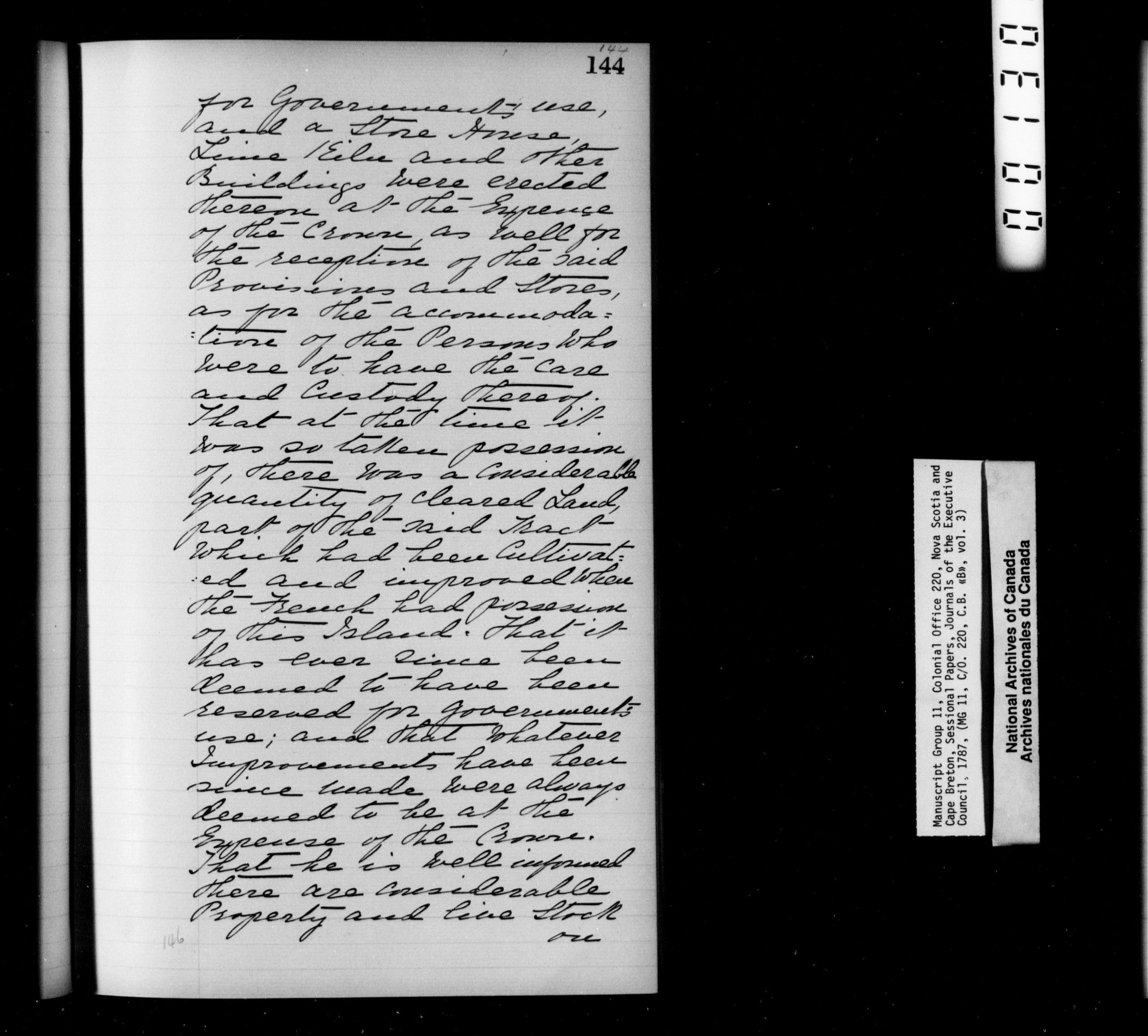for Governments' use, and a Store House, Lime Kiln and other Buildings were erected therein at the expense of the Crown, as well for the reception of the Said Provisions and Stores, as for the accommodation of the persons who were to have the Care and Custody thereof. That at that time it was so taken possession of, there was a considerable quantity of cleared land, part of the said Tract which had been Cultivated and improved when the French had possession of this Island.