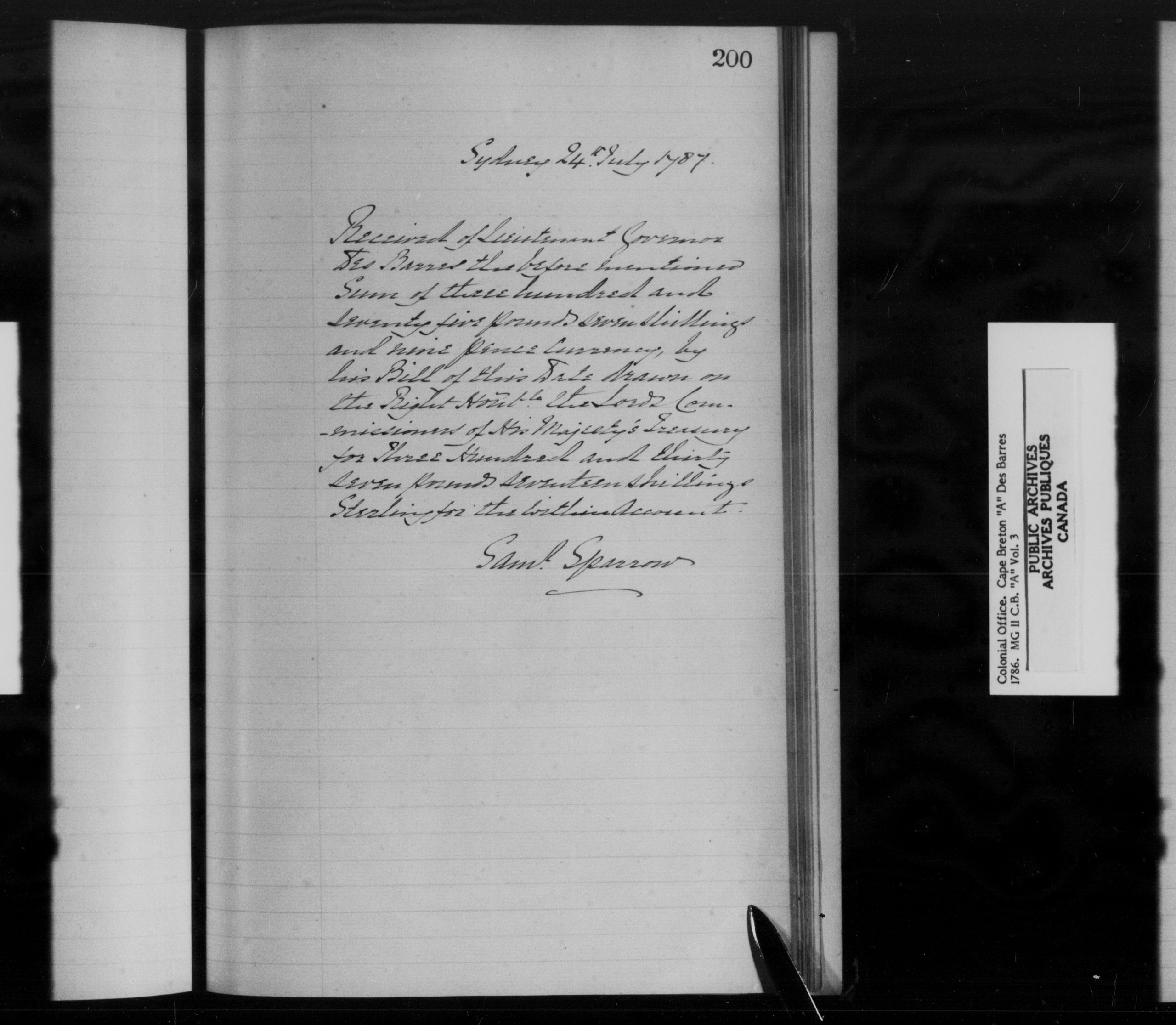 Nova Scotia and Cape Breton, Original Correspondence (CO 217), Colonial Office, Cape Breton "A", DesBarres, 1786, M.G. 11, C.B., Vol. 3, November 10, 1786 and July 24, 1787, pp. 199-201