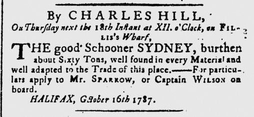 The good Schooner Sydney, burthen about Sixty Tons, well found in every Material and well adapted to the Trade of this place. -----For particulars apply to Mr. Sparrow, or Captain Wilson on board