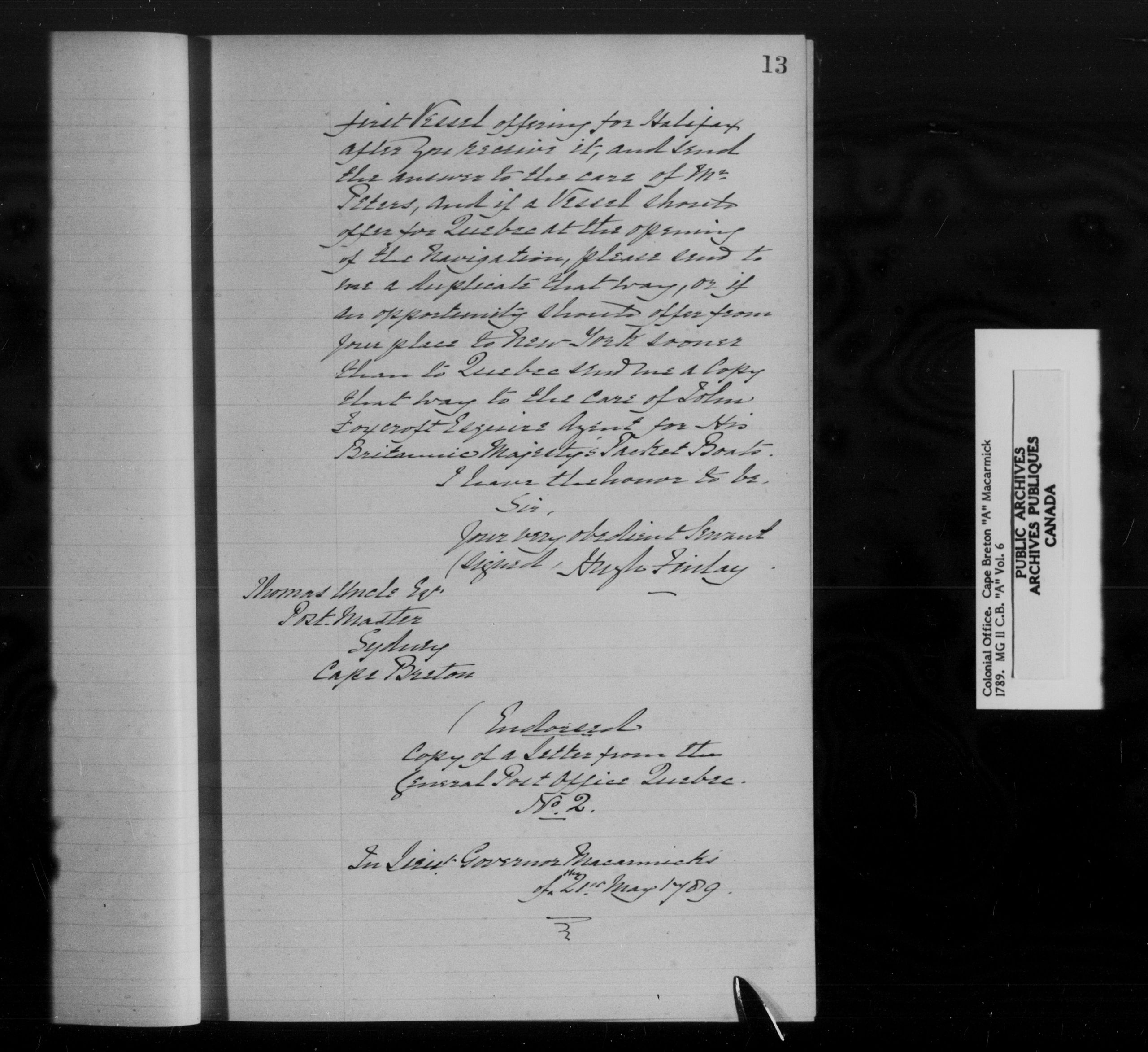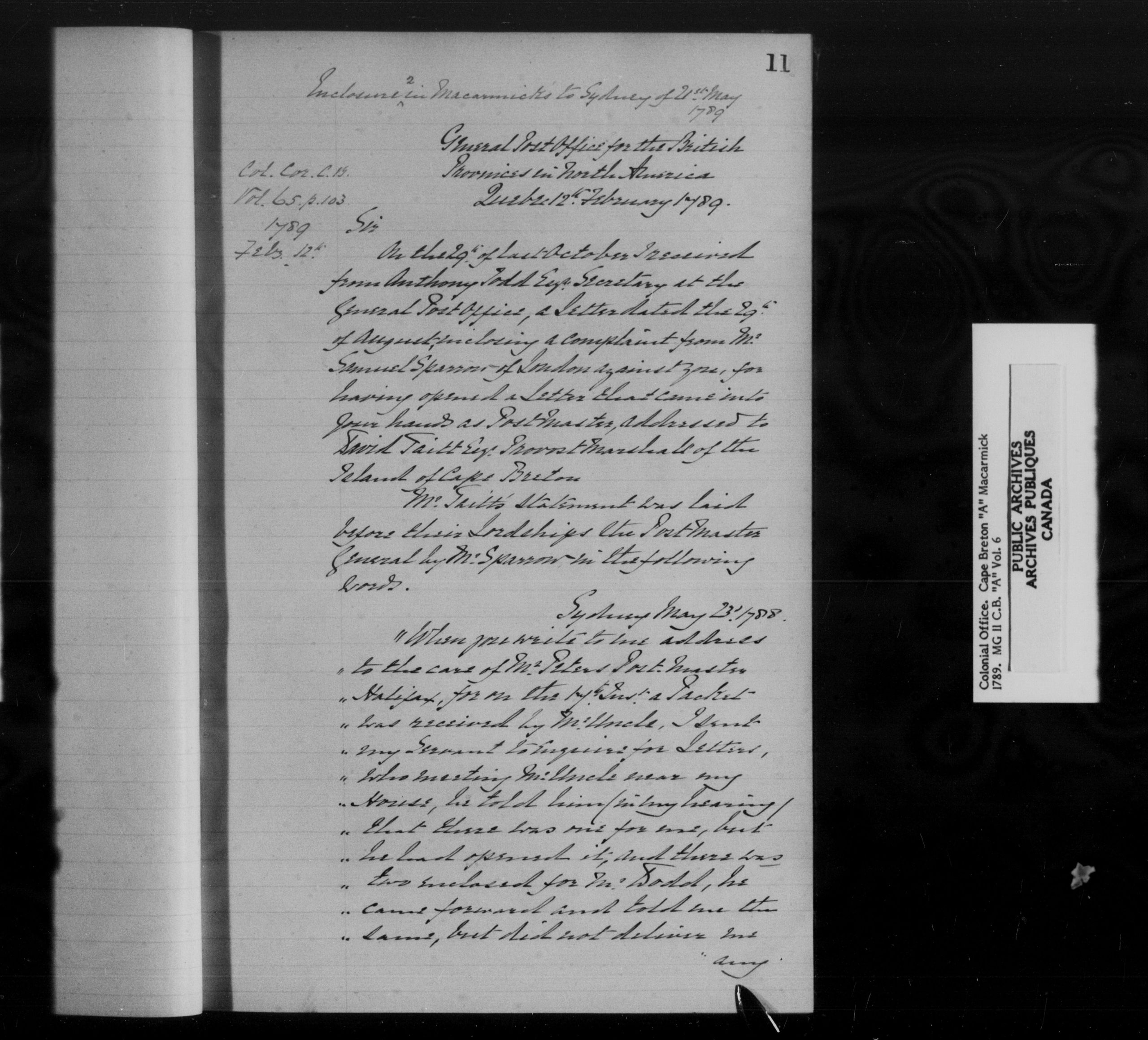 Colonial Office, Cape Breton "A" Macarmick, 1789. MG 11, C.B. "A", Vol. 6, pp. 11-13