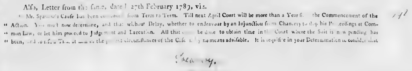 "Mr Sparrow's case has been continued from Term to Term. Till next April Court will be more than a Year from the Commencement of the Action. You must now determine, and that without Delay, Whether to endeavour by an Injunction from Chancery to stop his Proceedings at Common Law, or let him proceed to Judgement and Execution. All that could be done to obtain time in the Court where the Suit is now pending has been, and to risk a Trial at Law in the present circumstances of the Case is by no means advisable. It is requisite in your determination to consider that the costs of Proceedings in Chancery are very great and must be paid in Cash as the Business goes on, and that, for that purpose, a Sum of Money, or a [Fund] where to obtain What may be wanted from time to time to pay Fees, must be lodged in Halifax.