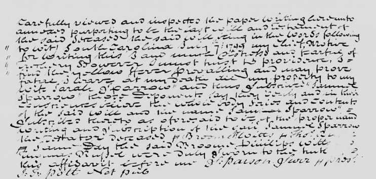 My Chief motive for writing this, I am much = = Distressed and fearful of Treachery: However, I must = trust to providence I find the yellow fever prevailing and may prove fatal. I leave at my death all my = property to my Wife Sarah Sparrow # Saml Sparrow 28th Decr : 1803 On which day appeared personally Broome Phillips Witts of Friday Street in the = = = Parish of Saint Margaret Moses London Gentleman and Thomas Russell of London Road in the Parish of St Georges Southwark in the County of Surry ﮚ Gentleman, and jointly and severally made Oath = that they knew and were well acquainted with Samuel Sparrow formerly of South Lambert in the County of Surry and late of Shadds Place Peckham in the Parish of St Giles Camberwell in the same County but in America deceased for many Years before and to the time of his death and during such times I have = = frequently seen him write and write and subscribe his name to writing and are Hereby become well acquainted with his Manner and character of hand writing and Subscription and having now carefully viewed and inspected the paper writing hereunto annexed purporting to be the last will and Testament of the said Deceased the said will being in the Words following "to Wit, South Carolina Being July 7th : 1799 my Chief Motive "for Writing this I am much Distressed and fearful of "treachery However I must trust to providence. I = " find the yellow Fever prevailing and may prove fatal. I leave at my death all my property to my wife Sarah Sparrow" and thus Subscribed "Samuel Sparrow" These Deponents say they verily and in their consciences believe the whole body Series and Contents of the Said Will and the named Samuel Sparrow" = Subscribed Hereto as aforesaid To be of the proper handwriting and subscription of the said Samuel Sparrow the Testator deceased # Broome P. Wilte # Thos Russell # Same Day the said Broome Philipps Witts and Thomas Russell were duly sworn to the truth of = this affidavit before me. Dr: Parsons Surr # press. J: J: pott Not pub |