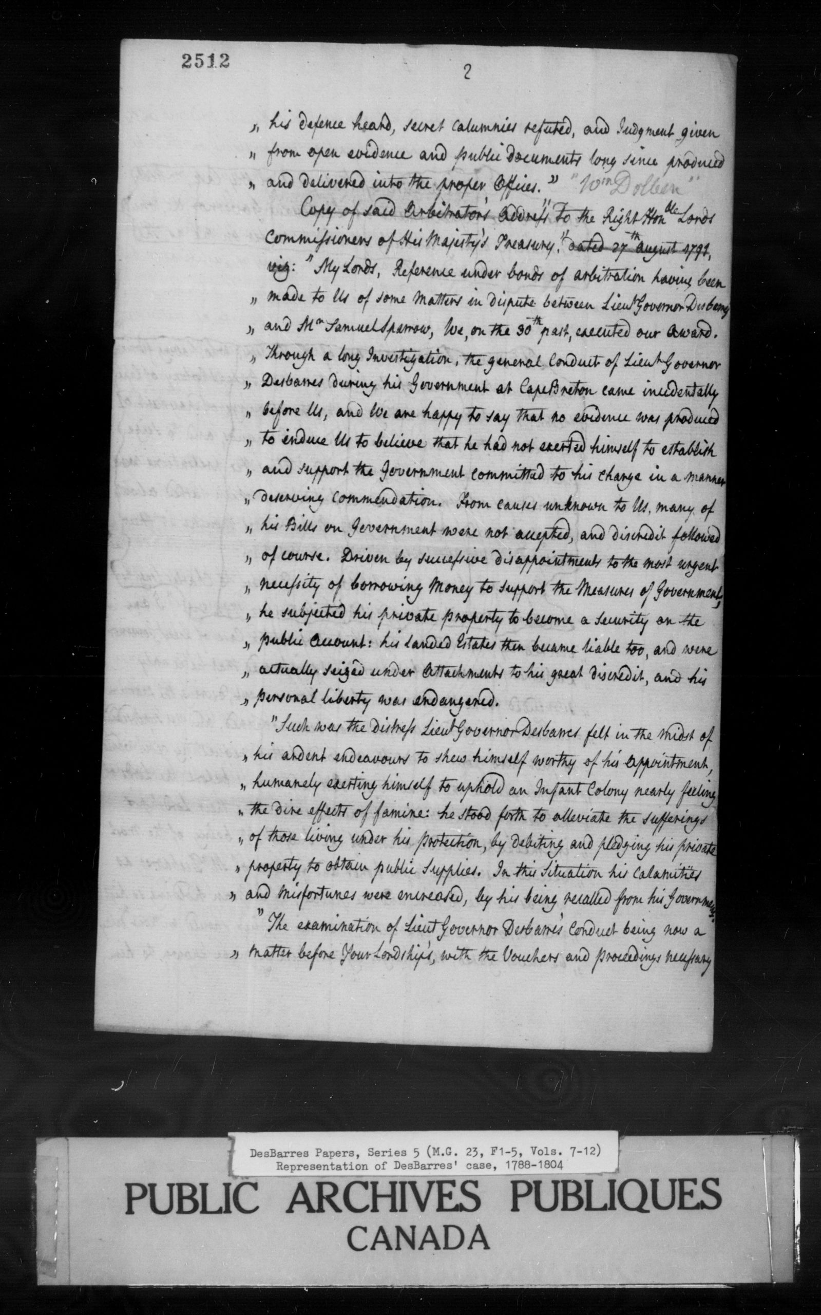 "Copy of a letter from Sir William Dolben to Charles Long Esqre. Secretary of the Treasury, dated 7th September 1791. viz: "I am desired by my brethren the Arbitrators on the Case of Lieutenant Governor DesBarres (for he has been constantly informed that he is only suspended from the exercise of his Government, during the examination of his Conduct which has been arraigned, and not superseded) to put into your Hands the enclosed Letter, requesting you would communicate the same to Mr. Pitt, and lay it before the Lords of the Treasury, humbly but earnestly entreating their Lordships immediate Consideration of the Subject; it being of the most decided consequence to the Honor and Fortunes of Mr. DesBarres, as well as Justice to him and the Public, as a Man holding so high and responsible a Character, that his Conduct should , without further delay, be investigated, the Charges against him be known to him, his Defence heard, secret Calumnies refuted, and Judgment given from open evidence and public Documents, long since produced and delivered into the proper Offices." [See also: September 7, 1791]